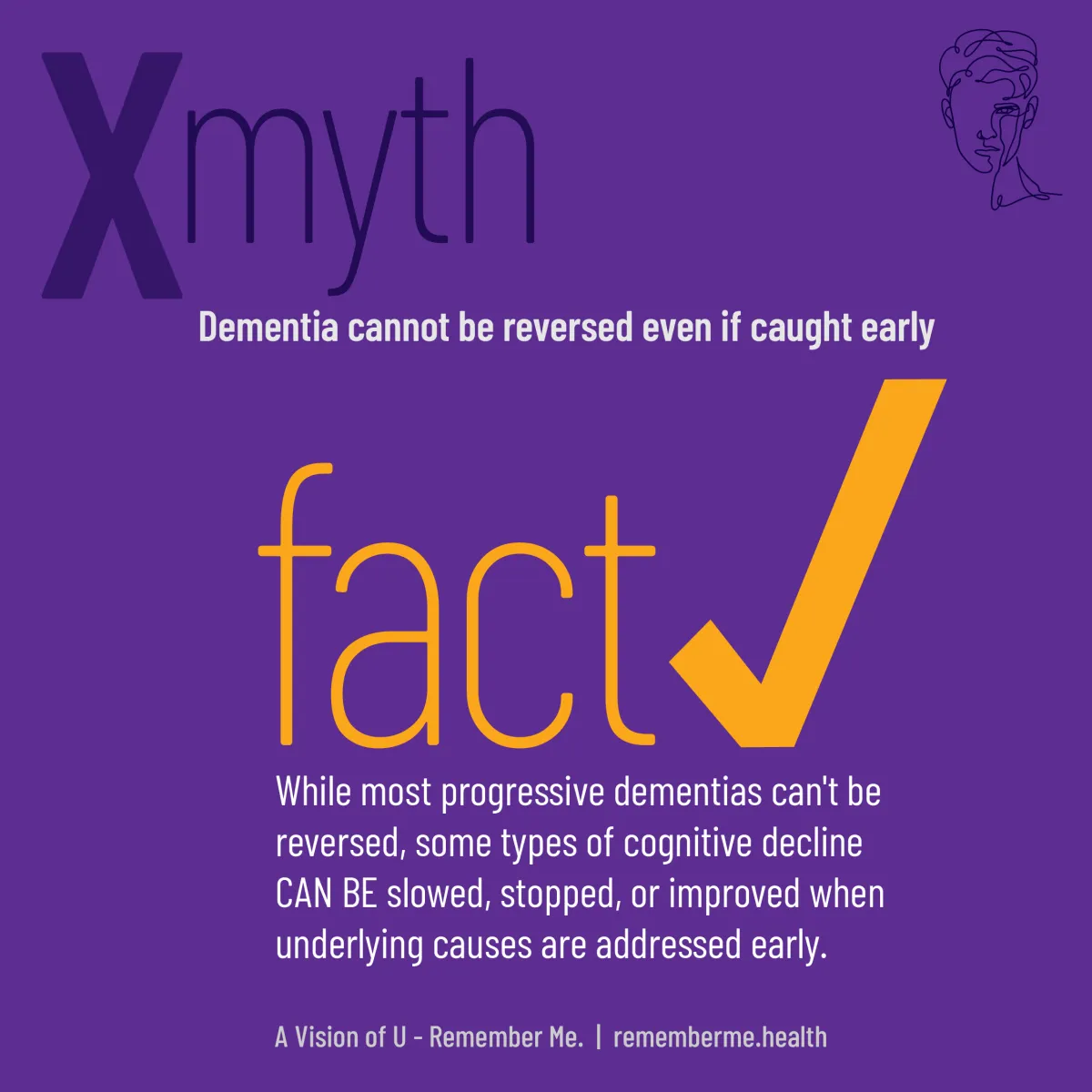 Fact: "While most progressive dementias can't be reversed, some types of cognitive decline can be slowed, stopped, or improved when underlying causes are addressed early."